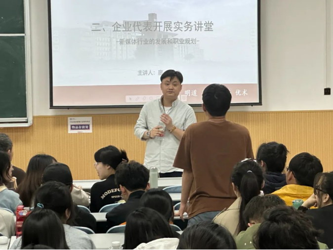 廖琰老师结合多年行业经历,介绍了电子商务和互联网发展的当前态势。他分析了在现代互联网环境下,新媒体行业如何通过不同的形式和工具向公众传达情感与体验的核心价值。通过互动式讨论,同学们积极参与思考并回答提出的问题,廖老师热情地分享了自身从业经验,解答了同学们的疑问,帮助他们为将来从事新媒体行业做好职业规划,整个讲座氛围轻松活跃。