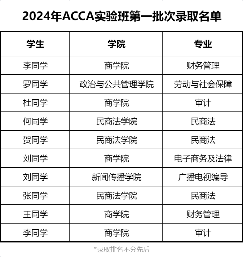 )ACCA实验班2024年度第一批次录取结束,现公布录取名单如下。