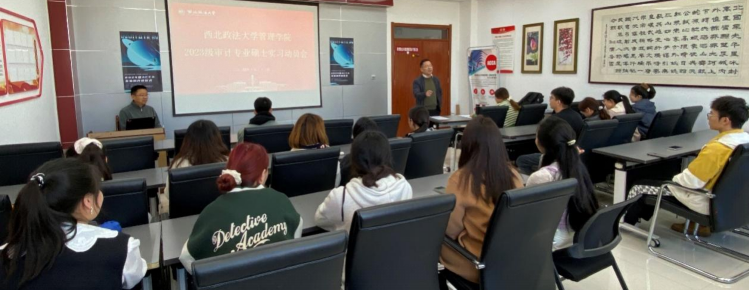 关于2023级审计专硕研究生实习安排的会议精神。安排部署了2023级审计专硕实践锻炼学习工作,详细介绍了实习单位的情况等,对实习考核管理等具体事宜进行了详细说明。要求同学们严格执行相关规定,鼓励同学们积极参与实践锻炼,圆满完成本次实践锻炼学习工作。