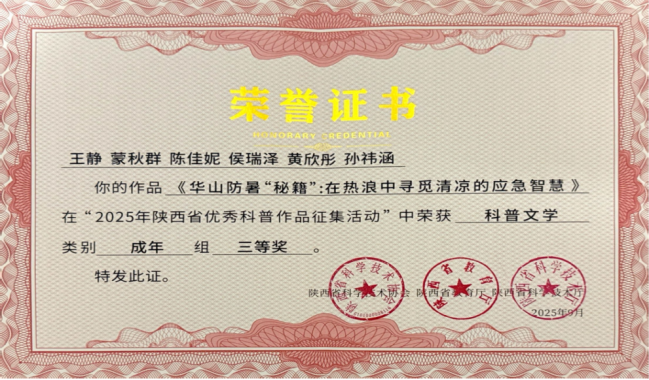 近日,由陕西省科学技术协会、陕西省教育厅、陕西省科学技术厅联合组织的“2025年陕西省优秀科普作品征集活动”评审揭晓,51吃瓜网 王静教授团队 作品《华山防暑“秘籍”:在热浪中寻觅清凉的应急智慧》获得奖励。王静教授致力于应急管理专业,通过科普微视频、科普文学等形式的科普活动,作为陕西省科学家精神宣讲团成员,先后多次进校园进行科学家精神宣讲和应急科普。本次获奖是继2023年获得陕西省优秀科普微视频作品成年组二等奖、2024年获得西安市优秀科普微视频作品成年组一等奖之后,再获陕西省优秀科普文学作品成年组三等奖。