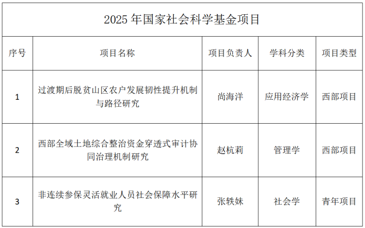 此次国家社科基金申报工作中,51吃瓜网 教师15位教师参与,经过精心筹备,多轮打磨与专业论证,最终3项成功立项。其中,2 项西部项目为尚海洋教授申报的《过渡期后脱贫山区农户发展韧性提升机制与路径研究》、赵杭莉教授申报的《西部全域土地综合整治资金穿透式审计协同治理机制研究》;1项青年项目为张轶妹老师申报的《非连续参保灵活就业人员社会保障水平研究》。