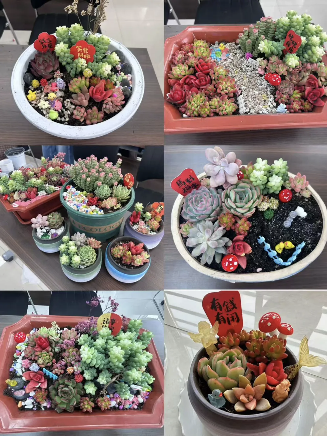 活动现场绿意盎然,多肉苗、创意花盆、营养土等基础物料及萌趣装饰摆件筹备齐全。学院特邀专业指导老师现场授课,细致讲解多肉种植、搭配及养护技巧,结合实物示范答疑解惑,帮助大家快速掌握创作要领。自主创作环节,老师们化身“园艺设计师”,巧思搭配植株与摆件,打造出一件件各具特色、生机盎然的微景观作品,完成后大家手捧作品打卡合影,定格美好瞬间。
