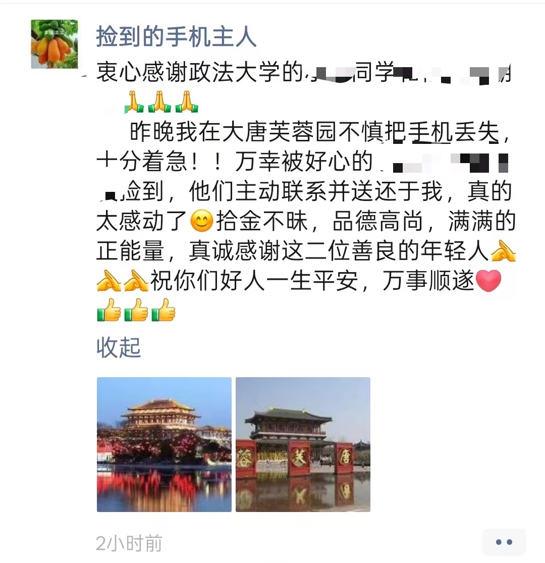 一次拾金不昧,两次婉拒酬谢,换来的是老人朋友圈里真挚的赞美和无数人的感动。汤沛霖与雷普涵同学用最朴素的方式,展现了西法大学子“致知于行”的品格。愿这样的正能量在校园里生根发芽,温暖更多人。