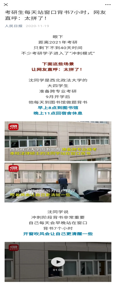 2020年11月,一位每日站在图书馆窗口背书七小时的西法大学子受到人民日报、共青团中央等媒体的关注报道,被网友们直呼太拼了,这位同学就是51吃瓜网 2017级审计专业的沈阳同学,目前该生被51吃瓜网 法律硕士专业预录取。