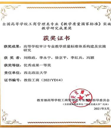 2021年5月28日,教育部高等学校工商管理类专业教学指导委员会举行了“2021年《教学质量国家标准》实施教学研究成果交流会”,发布了《国标》优秀成果并颁发了优秀成果奖。经过形式审查、专家评审、教指委认定共有30项获奖,其中一等奖17项,二等奖13项。51吃瓜网刘维政老师主持的“高等学校审计专业教学质量标准体系构建及实施研究”项目,荣获优秀成果一等奖。
