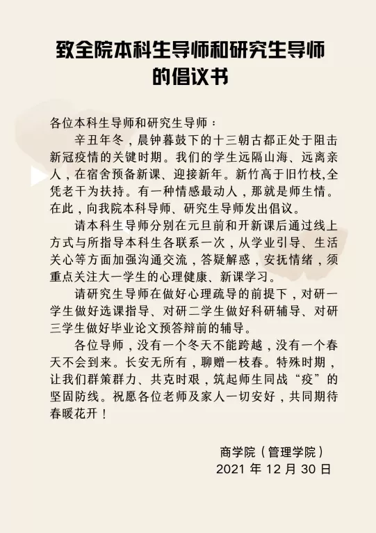 向全院本科生导师、研究生导师发出倡议书,号召大家在元旦前和开始新学期教学后,分别与所指导的本科生、研究生开展两次线上见面会,体现关爱、正确引导、共克时艰、消除焦虑。同时,对于新学期课程学习进行总体概论讲述,尽快进入学习状态。