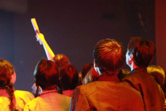 步履轻盈欢快的左右呼号四海的学子,手中书卷不放。他们说翻滚的时代浪潮中赤诚之子的灵魂终要抗争,终要向明日追寻一个美丽的答案——延安。载歌载舞而来,汇聚在舞台中间,红色的灯光铺满每个人的四肢,映照每个人的面庞。他们面对自己心中那个燃烧的原野。雀跃的心情主宰着青年的灵魂,舞者的内心,高高跃起时他们看见这一路的伙伴。他们汇聚又分开——汇聚在延安,四散到祖国各地种下革命的火种,掀起燎原的红色火光,使得大地面目为之一新!