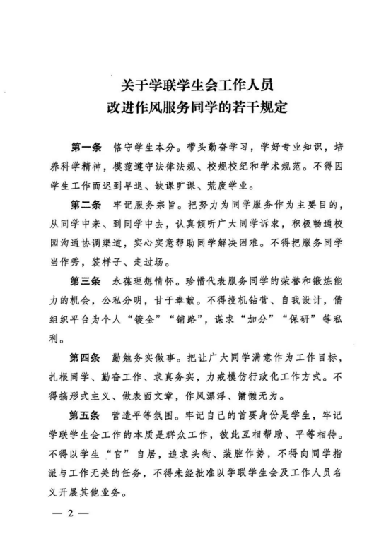 第二条牢记服务宗旨。把努力为同学服务作为主要目的,从同学中来、到同学中去,认真倾听广大同学诉求,积极畅通校园沟通协调渠道,实心实意帮助同学解决困难。不得把服务同学当作秀,装样子、走过场。