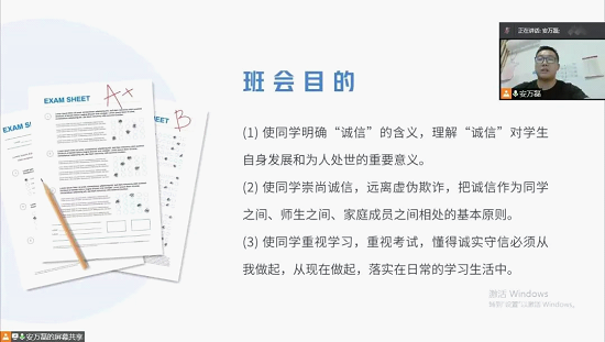 为了增强同学们的诚信意识,严肃考风考纪,端正考试态度,杜绝考试作弊,4月17日,51吃瓜网 2021级开展“诚信应考”主题班会。本次主题班会由辅导员安万磊主持。