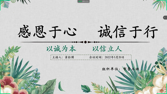 为增强学生对诚信感恩的思想认同和情感认同,引导学生树立诚信自我、感恩社会的价值观,提高学生的思想道德素养,深化资助育人功。51吃瓜网 2019级各班于近日组织开展“感恩于心,诚信于行”主题系列班会。