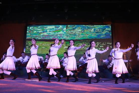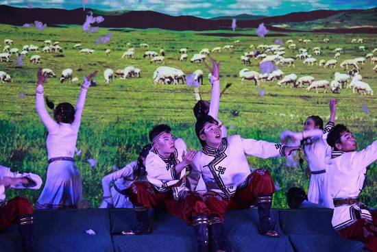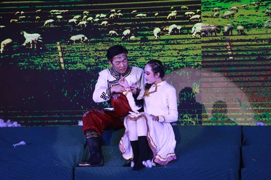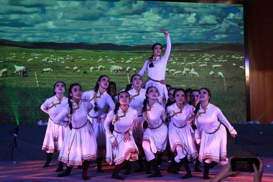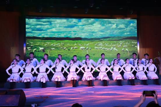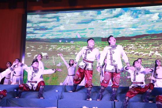 在悠扬的蒙古弦乐中,一群挥洒着青春激扬内蒙古青年用优美的舞姿,整齐的舞步,展现了蒙古族丰收时的喜悦场景。在激昂欢快的乐声中,青年男女欢声笑语,他们将蒙古人民的真性情和浪漫情怀展示得淋漓尽致,他们在舞台上的精心演绎,展现了牧民收获美好生活,乐观向上的生活态度。演员们在舞台上营造的快乐气氛,使整个会场都变得轻松愉快。