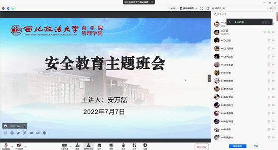 2022年7月7日,2021级辅导员安万磊线上组织召开假期安全教育主题班会,2021级全体学生共同参与。