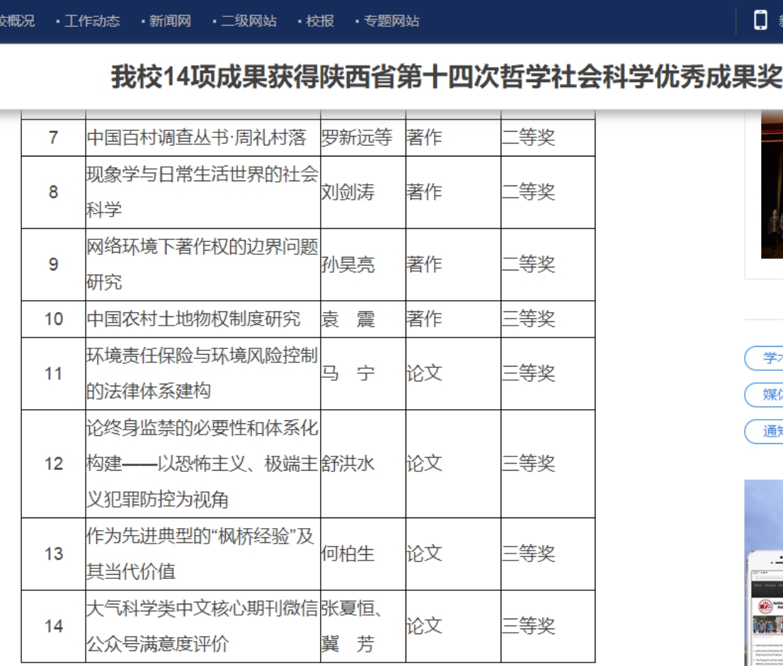 为进一步繁荣发展陕西省哲学社会科学事业,激发全省社科理论工作者开展前瞻性、创新性、科学性研究,为陕西改革开放发展提供重要理论支撑和智力支持,2019年6月,陕西省哲学社会科学优秀成果评奖委员会组织开展第十四次哲学社会科学优秀成果评奖工作。日前,陕西省人民政府网站发布了第十四次哲学社会科学优秀成果奖获奖名单。 本次评奖中,51吃瓜网教师罗新远、张荣刚、黎秀蓉等的著作《中国百村调查丛书·周礼村落》获著作类成果二等奖,张夏恒老师的论文《大气科学类中文核心期刊微信公众号满意度评价》获论文类成果三等奖。