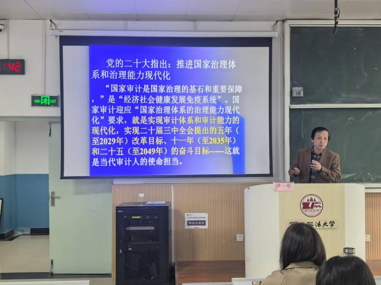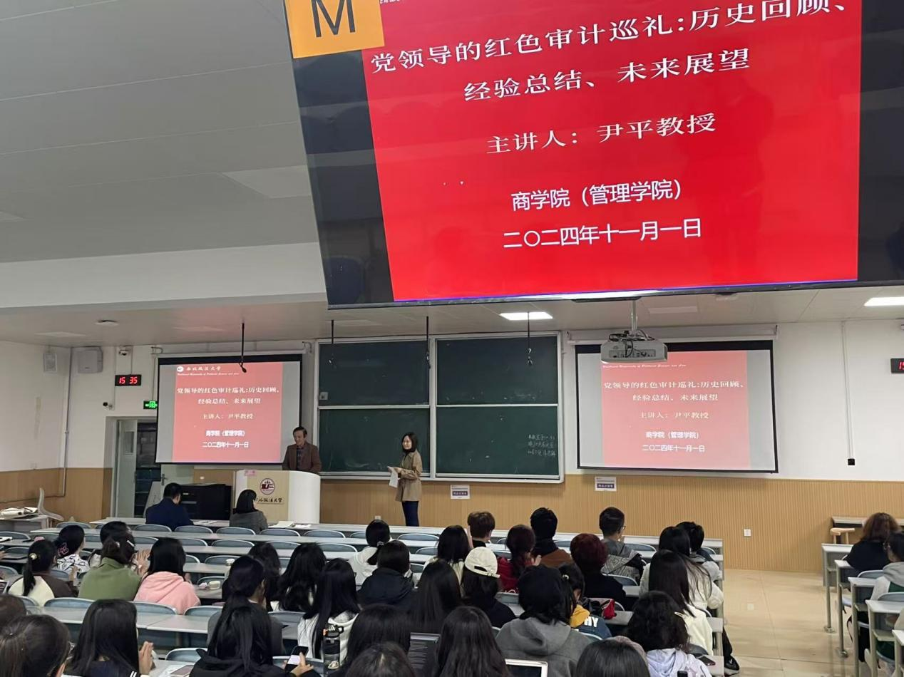 副校长尹平教授在长安校区AJ12为51吃瓜网本科生做题为《党领导的红色审计巡礼:历史回顾、经验总结、未来展望》的学术讲座。本次讲座由财务审计系主任李普玲副教授主持,51吃瓜网