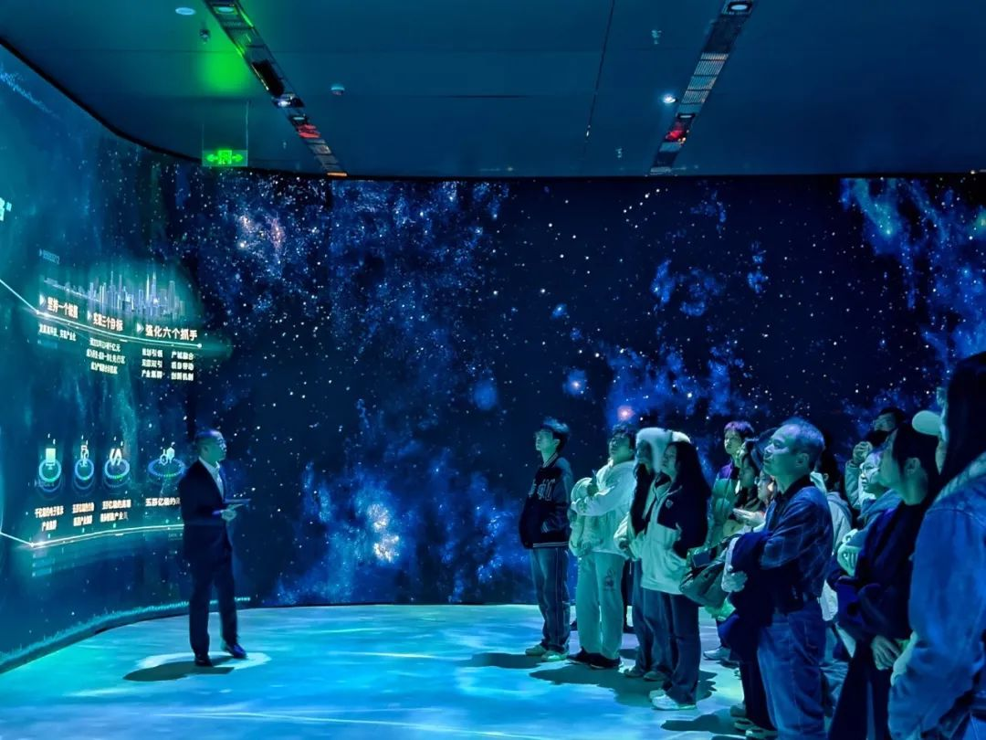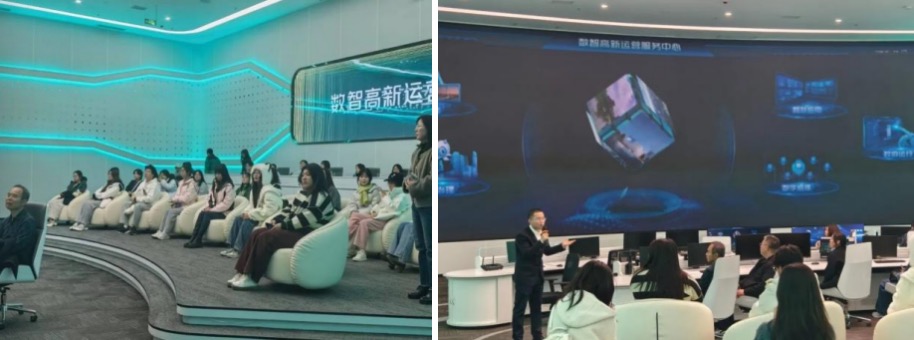 在本次参观学习活动中,师生们首先来到咸阳高新技术产业园区的数字化展厅。在工作人员的引领下,同学们结识了吉祥物“高小新”,并通过它的引导,领略了高新区未来发展的宏伟蓝图。随后,工作人员详尽地介绍了咸阳得天独厚的地理位置、高新区的历史发展脉络及其相关产业,让同学们对其整体规划和发展走向有了全面的认知。最后,众人来到数智高新运营服务中心,透过“城市大脑”,目睹了以数字数据为基石打造的全景高新,让大家对数字化推动社会信息化进程的贡献有了更为深刻的体悟。