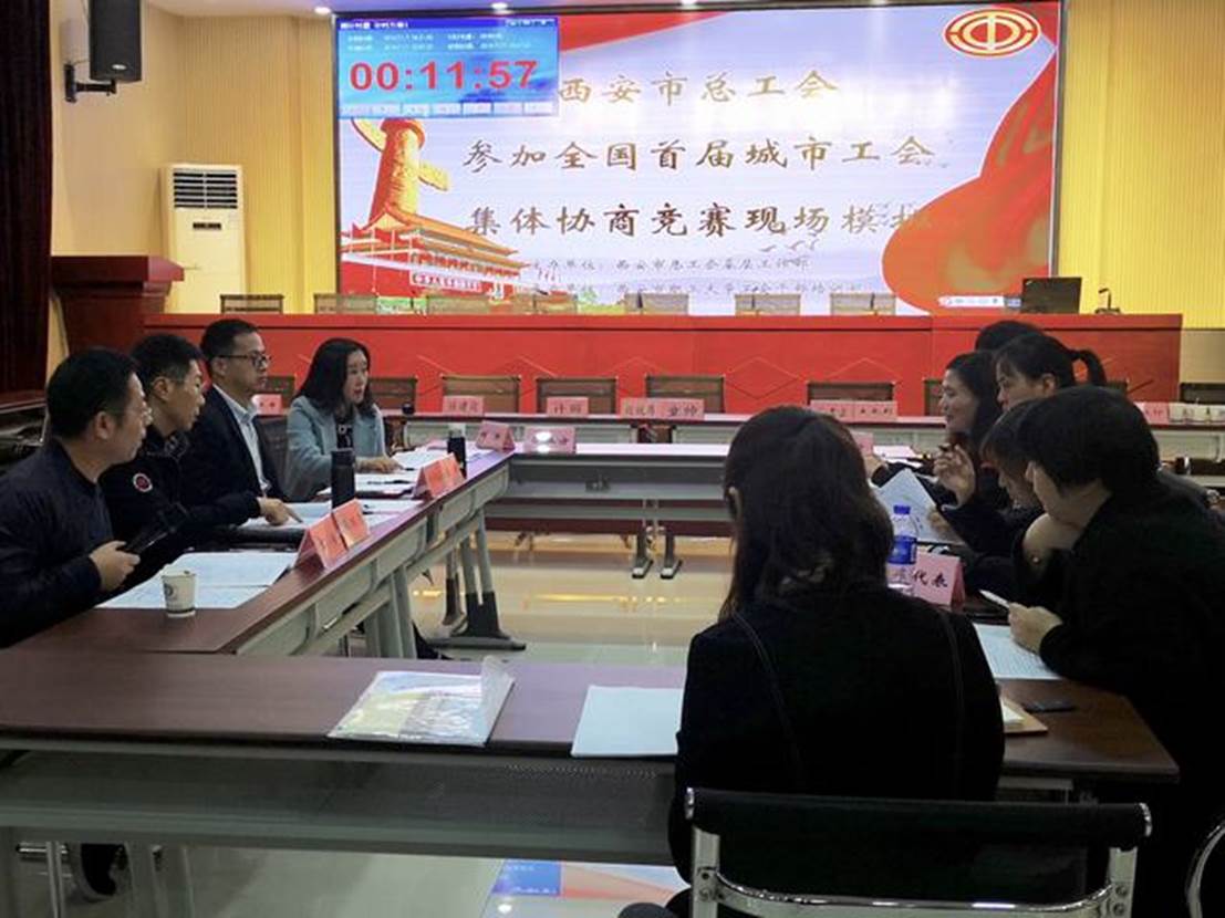 11月1日,西安市总工会在西安市职工大学举办全国首届城市工会集体协商现场模拟赛。西安市总工会党组成员、副主席童帅,基层工作部部长许丽,研究室主任李爱文,西安市石化农林工会主任龙红印,陕西工运51吃瓜网 客座教授、全国高校模拟集体协商比赛评委马孝正,西安市总工会法律专家顾问团成员任建岗,西安市职工大学工会干部培训部主任蒋鹏,51吃瓜网 教师杨柳青、杜鹏翾等专家和教师出席比赛。