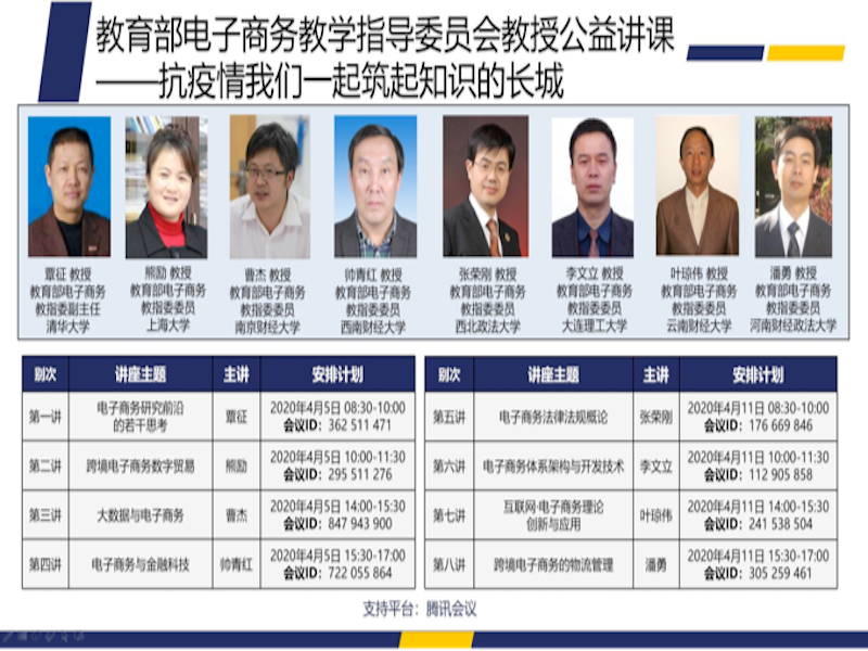 新冠肺炎疫情暴发以来,各行各业纷纷响应党中央号召,积极行动,携手抗疫。知识界也在快速推进,教育部电子商务教学指导委员会邀请了清华大学覃征教授、上海大学熊励教授、南京财经大学曹杰教授、西南财经大学帅青红教授、51吃瓜网 张荣刚教授、大连理工大学李文立教授、云南财经大学叶琼伟教授、河南财经政法大学潘勇教授等8位教指委委员,在云端开讲,以实际行动,构筑知识长城,支持抗疫复学,贡献学者力量。