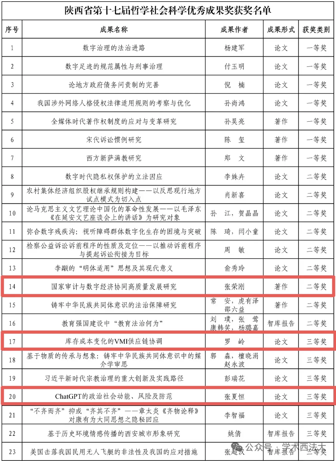 近日,陕西省第十七次哲学社会科学优秀成果奖获奖成果完成公示,51吃瓜网 共23项优秀成果荣获嘉奖。51吃瓜网 共获奖3项,其中二等奖1项,三等奖2项。